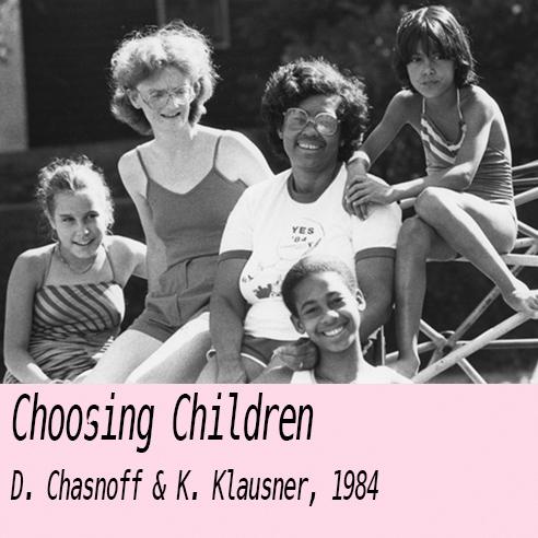 Choosing Children is an endearing, often funny, film about lesbians and their children. It focuses on interviews with six lesbian-led families, living in different parts of the USA; the women are African-American, white, Latino; the families include couples, single women, a lesbian and gay man co-parenting, and a group of women who share parenting responsibilities.